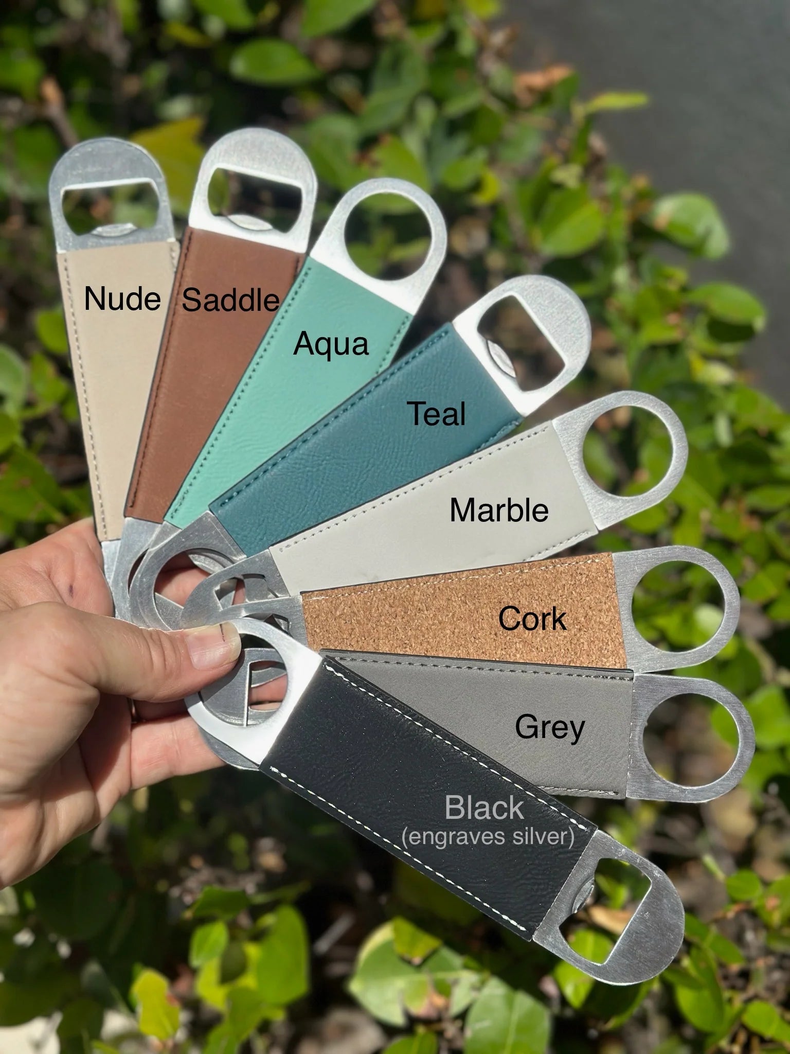 • Color Options: Choose from Nude, Saddle, Aqua, Teal, Marble, Cork, Grey, or Black (engraves silver).
